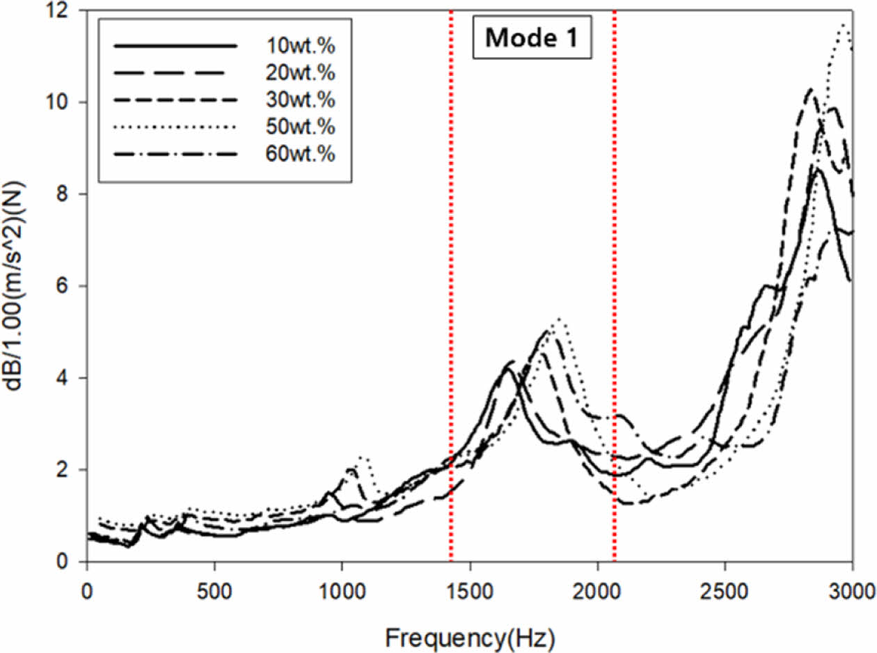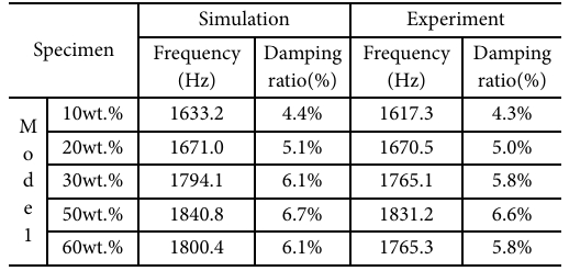 4. 진동 감쇠 성능 시뮬레이션 결과, 강화재의 질량분율이 높아질수록 진동감쇠 성능이 비례하여 증가하는 경향을 나타내지만, 어느 수준 이상에서는 더 이상 증가하지않고, 소폭 감소하는 결과를 나타내었다. 실제 실험값과 시뮬레이션 값과의 비교 결과, 5% 이내의 근사치를 나타내었으며, 강화재의 질량분율이 60 wt.%일 때 결과값의 차이가 가장 크게 발생하였다.