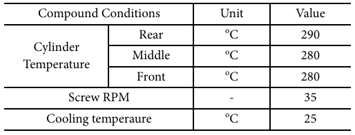 열가소성 복합재료 시편을 제조하기 이전에, PA66 소재는 흡습된 수분을 제거하기 위하여 80oC 오븐에서 24시간동안 건조 후 사용하였다. 열가소성 복합소재를 제조하기 위하여 1차적으로 컴파운드(compound) 공정을 진행하였다. 컴파운드 공정 시 발생하는 손실율을 고려하여 각 소재(PA66, GF)는 10 kg씩 소분한 후에, 4회의 hand mixing 작업을 실시한 후 사용하였고, 유리섬유의 질량분율(10, 20, 30, 50, 60 wt.%)에 따라 컴파운드 공정을 실시하여, 길이 3 ± 0.1 mm의 펠렛(pellet) 형태의 시편을 생성하고자 하였다. 컴파운드 공정 시, 열안정제(1.5 wt.%), UV 안정제(1.0 wt.%), 산화방지제(0.5 wt.%)를 첨가한 혼합 유체(PA66/GF/첨가제)를 사용하였고, 혼합 유체의 가공 장비 내에 In-situ 상태에서의 screw element와 RPM 설정에 따른 복합재료의 물성파악을 위한 용도로 이축압출기(twin screw extruder, HAAKEpolylab QC Inc., Netherlands)를 사용하였다. 이축압출기를 활용한 컴파운도 공정 조건은 Table 1에 나타내었다.