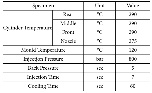 컴파운드 공정 조건을 통하여 제조된 펠렛형태의 시편은 60oC에서 12시간 동안 건조하여 시편의 수분함유량이 약 0.2% 수준이 되도록 유지시켰다. 사출성형(injection molding) 공정을 통하여 열적 특성 및 기계적 특성 분석을 위한 시편 형태로 가공하였다. 사출 성형 공정은 lab.scale의 사출 성형기(HAKKE MINIJET Pro, Thermo scientific Inc., Netherlands)를 이용하여 진행하였다. 펠렛 형태의 시편은 사출 성형기의 실린더 내에 히터(heater)에 의해 공급되는 열에너지와 전단력에 의하여 용융되었고, 호퍼(hopper)의 밑 부분은 원활한 고체 이송을 위하여 충분한 냉각을 실시하며 용융부는 수지가 충분히 용융될 수 있는 온도를 설정하였다. 노즐 부위는 용융부에 비하여 약 15oC 정도 낮게 설정하여 용융 수지의 흘러내림을 방지하였다. 사출 성형기를 이용한 열가소성 복합재료 시편 제작 조건을 Table 2에 나타내었고, 컴파운드 및 사출 성형 공정에 대한 공정도를 Fig. 1에 나타내었다.