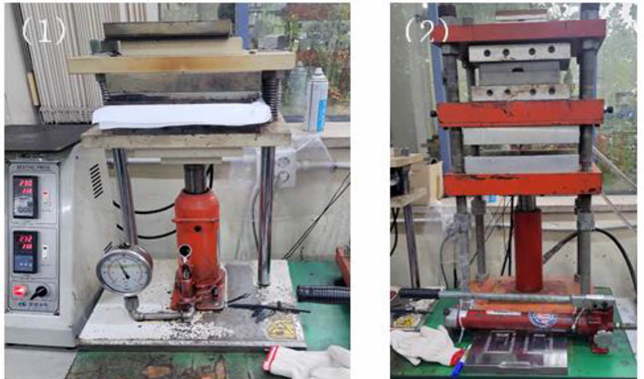 Fig. 1 Equipment used to produce carbon fiber reinforced composite materials; (1) Hot press, (2) Cooling press |