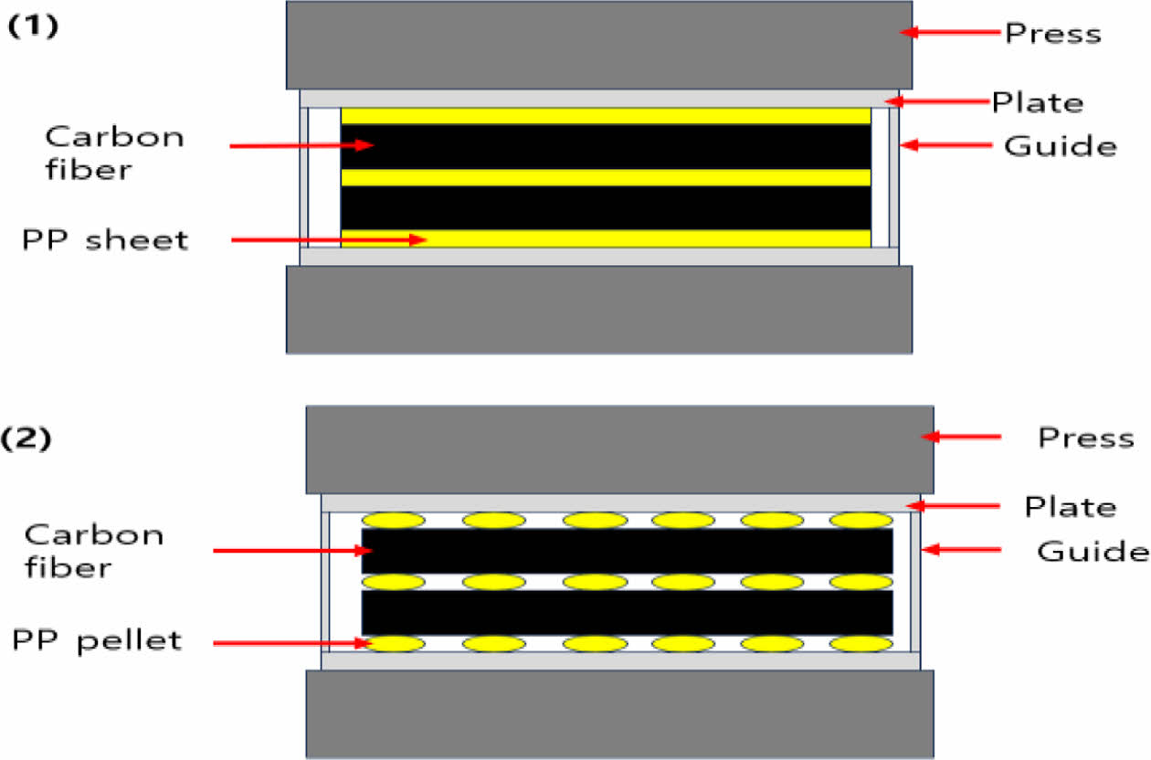 Fig. 2 Schematic diagram of press process (1) used PP pellet as a polymer (2) used PP sheet as a polymer |