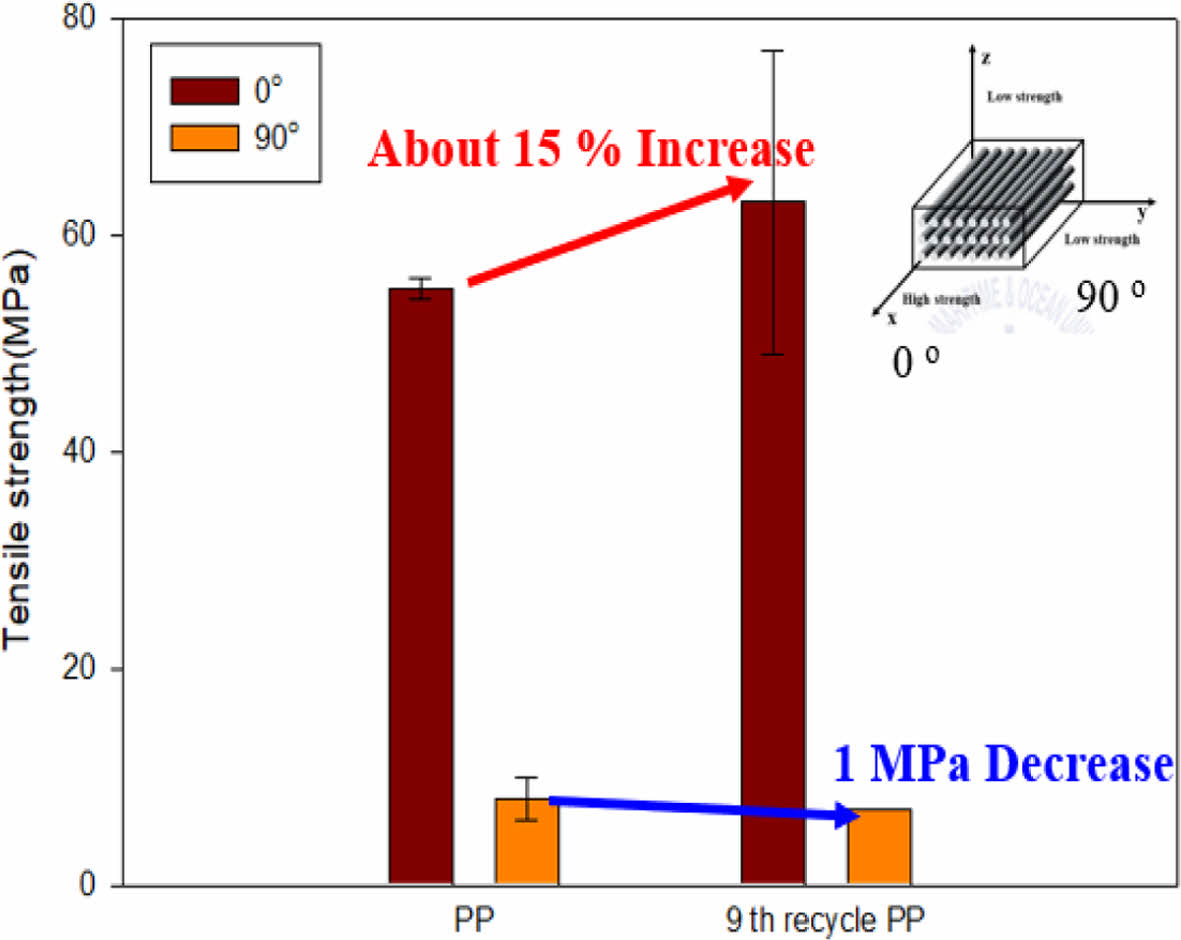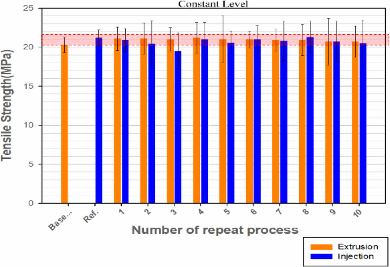 Fig. 4 The effect of differences in the number of repeated processing and processing methods on the tensile strength of PP polymer |