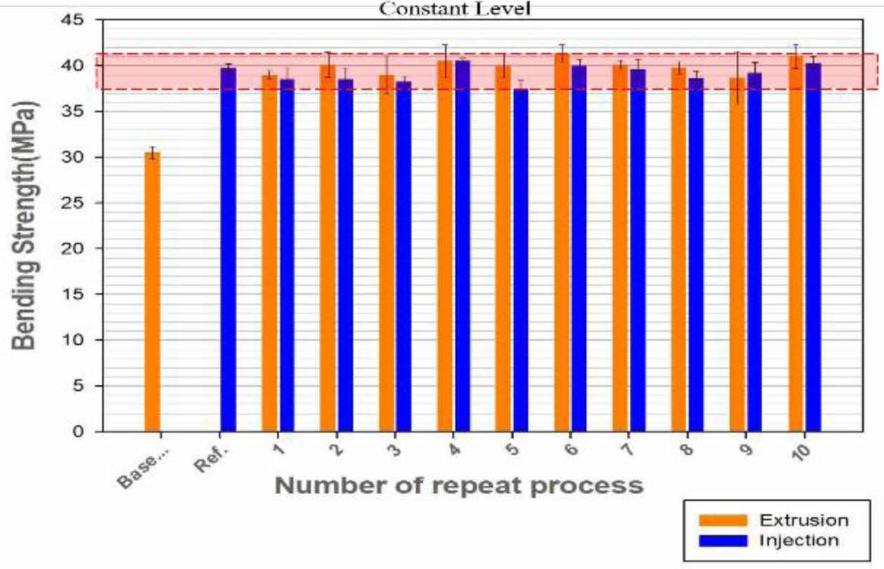 Fig. 5 The effect of differences in the number of repeated processing and processing methods on the bending strength of PP polymer |