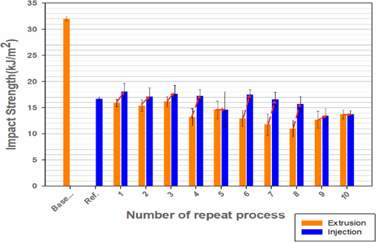 Fig. 6 Impact strength of PP depend on the number of repeated melting processes |