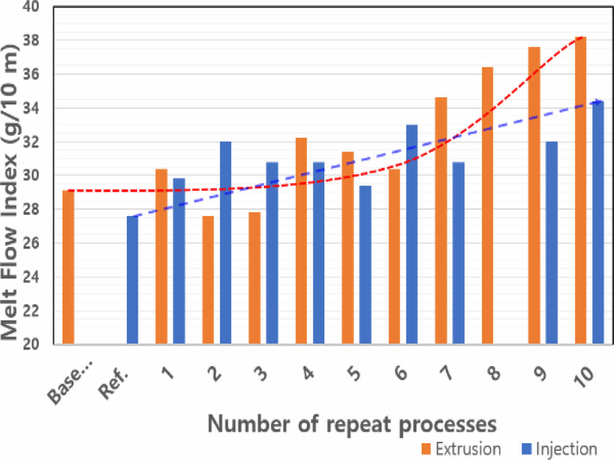 PP에서 뿐만 아니라 poly(hydroxybutyrate-co-hydroxyvalerate) 수지를 트윈 스크류 압출과 사출 성형을 사용하여 다중 용융 가공(5사이클)을 통해 재활용성에 대한 연구도 진행되고 있는데, 폴리머의 분자량이 급격히 감소하지 않았으나 세 번째 사이클 이후에는 비결정성의 하락이 관찰되었으며 열분해 설정 값은 매우 약간 감소하였다. 반면, PLA 재활용에서는 10번의 압출 공정 후 폴리머의 개시 온도 감소와 관련된 기계적 특성의 감소가 덜한 것으로 나타났다[13-16]. 이러한 다수의 문헌에서 열가소성 수지의 종류에 따라 반복 가공에 따라 물성의 저하가 일어나는 것을 확인할 수 있었고 수지의 종류와 첨가 성분 및 가공 조건에 따라서 품질의 저하가 발생하는 시점을 다르다는 확인할 수 있었다 [17-19].