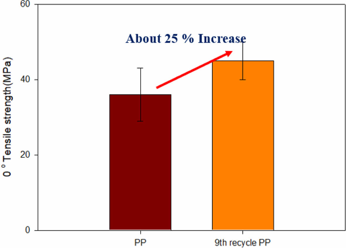 반복 공정의 횟수에 따라 충격 강도 이외의 인장강도 및 굽힘 강도의 저하가 크게 나타나지 않았고 반복 공정의 횟수가 증가함에 따라 용융 흐름 지수가 높아진 것을 기초로 일방향 탄소섬유 강화 복합재료의 기지재로 반복회수가 어떠한 영향을 평가하는지 확인하기 위해서 반복하여 제작된 펠렛과 제작된 펠렛을 추가 가공하여 시트로 제작한 다음 각각의 수지를 일방향 탄소섬유에 함침시켜 복합재료 시험편을 제작하였다. 대표적으로 가공하지 않은 PP 수지와 9회 반복 가공한 PP 수지를 선택하였는데 9회 반복 가공한 PP 수지를 선택한 이유는 시트 형태로 가공한 것도 반복 가공 횟수에 포함시켜 최대 10회 가공으로 한정하여 인장강도의 저하가 없이 MFI만 증가시켜 반복 가공 횟수가 섬유강화 복합재료 기지재로서 함침과 인장강도에 영향을 미치는 것 만을 평가하기 위함이다.