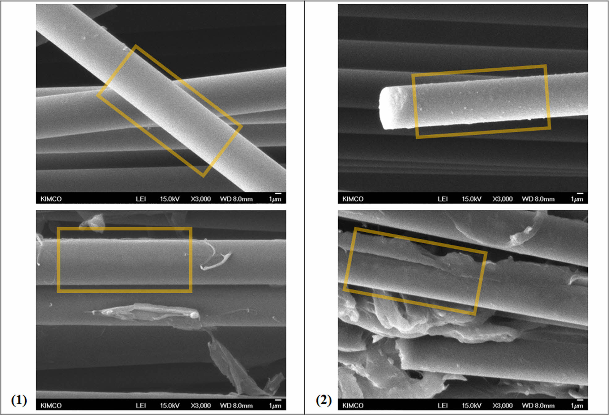 Fig. 10은 시편 가공 후 가공면을 SEM (Scanning Electron Microscope)을 통해 관찰한 것을 나타냈다. 베이스 PP를 사용한 경우 시편의 섬유와 수지와의 결합이 반복 가공을 거친 시편보다 미세하게 적게 남았음을 확인할 수 있었다. 이는 반복 가공 시편에서 PP의 점성이 낮아지고 흐름성이 보완되었기 때문에 섬유 함침에 있어 이점을 가져왔다고 판단된다. 함침 정도를 통해 섬유와 수지 사이 계면 결합력을 평가할 수 있으며 반복 가공을 통한 계면 결합력의 향상은 위 기계적 물성 향상에도 영향을 끼쳤다는 것을 확인할 수 있다.