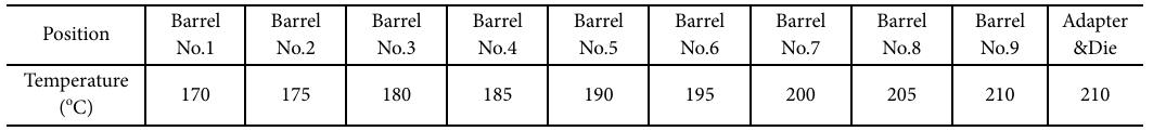 MFI(Melt Flow Index) 측정은 ISO 1133 및 ASTM D1238에 따라 열가소성 폴리머 용융물의 흐름 용이성을 측정하였다. 본 연구에 사용된 PP의 MFI 측정조건은 유효하중 2.16 kg, 전단속도 30~1000 s-1의 조건에서 측정하였다. MFI 검정은 동일한 추세가 3회 이상 나타날 때까지 반복적으로 측정되었다.