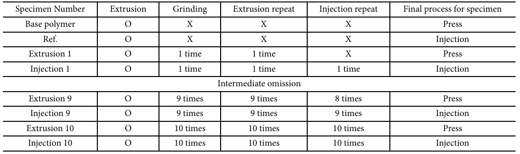 본 실험에서는 반복 공정에 의한 성능 변화를 평가하기 위해 PP 시험편에 대하여 인장 시험, 굽힘 시험, 충격 시험, MFI 시험을 진행하였다. 압출공정, 사출공정 및 분쇄등을 통한 반복공정 시험편의 제작공정에 대한 모식도와 시험편 별 반복공정에 대한 내용을 Fig. 3에 나타내었고 시험편의 자세한 조건은 Table 4에 표시하였다. 인장 시험은 ASTM D638에 의거하여 시험을 진행하였으며, 도그본 형태의 시편으로 제작하였다. 또한 굽힘 시험은 ASTM D790에 의거하여 시험을 진행하였으며, 시편은 직사각형 시편으로 제작하였다. 충격 시험의 경우 ASTM D 6110에 의거하여 샤르피 충격시험을 진행하였으며, MFI 시험의 경우 ASTM D 1238에 의거하여 시험을 진행하였다. 인장, 굽힘 시험의 경우 대경엔지니어링 사의 Universal Test Machine을 사용하였으며 최대 하중은 1,000 kgf이다.