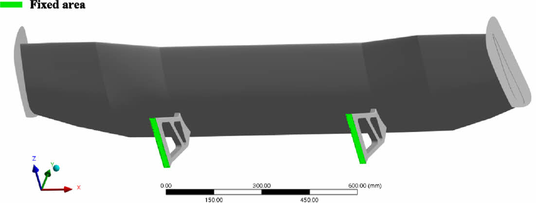 리어 스포일러는 리어의 다운 포스를 증가시킴으로서 주행 시 자동차 후미에 발생하는 drag를 상쇄하는데 목적이 있다. 본 연구에서 사용된 CFRP 리어 스포일러의 형상은 SEIBON 社의 GTWING-1이며, 이 리어 스포일러의 대표 치수는 Fig. 1에 도시하였다. 이를 바탕으로 해석에 필요한 형상을 모델링한 결과는 Fig. 2에 도시하였다.