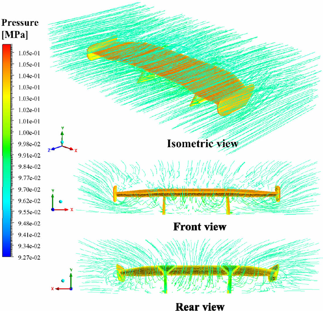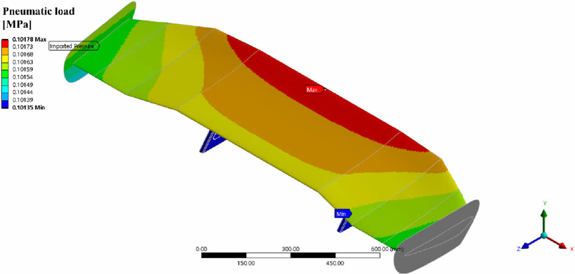 고속 주행 상황에서 CFRP 리어 스포일러의 변형량과 응력분포를 알기 위해, Section 2.4의 유체해석 결과로부터 구해진 압력 분포에 의한 공압하중을 CFRP 리어 스포일러 모델 표면에 적용 후 구조 해석을 수행한다. Fig. 7은 공압하중을 CFRP 리어 스포일러 표면에 적용한 결과를 나타낸다. 여기서, CFRP 리어 스포일러의 구조해석시 사용한 구조해석 모델의 노드수는 약 38만개, 엘리먼트 수는 약 30만개이다.