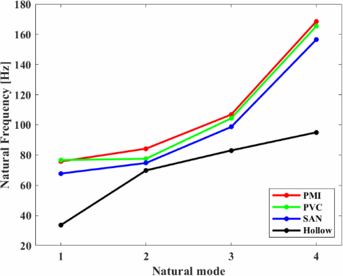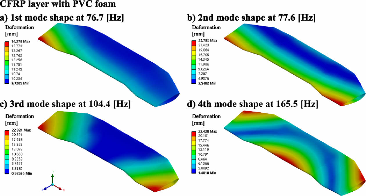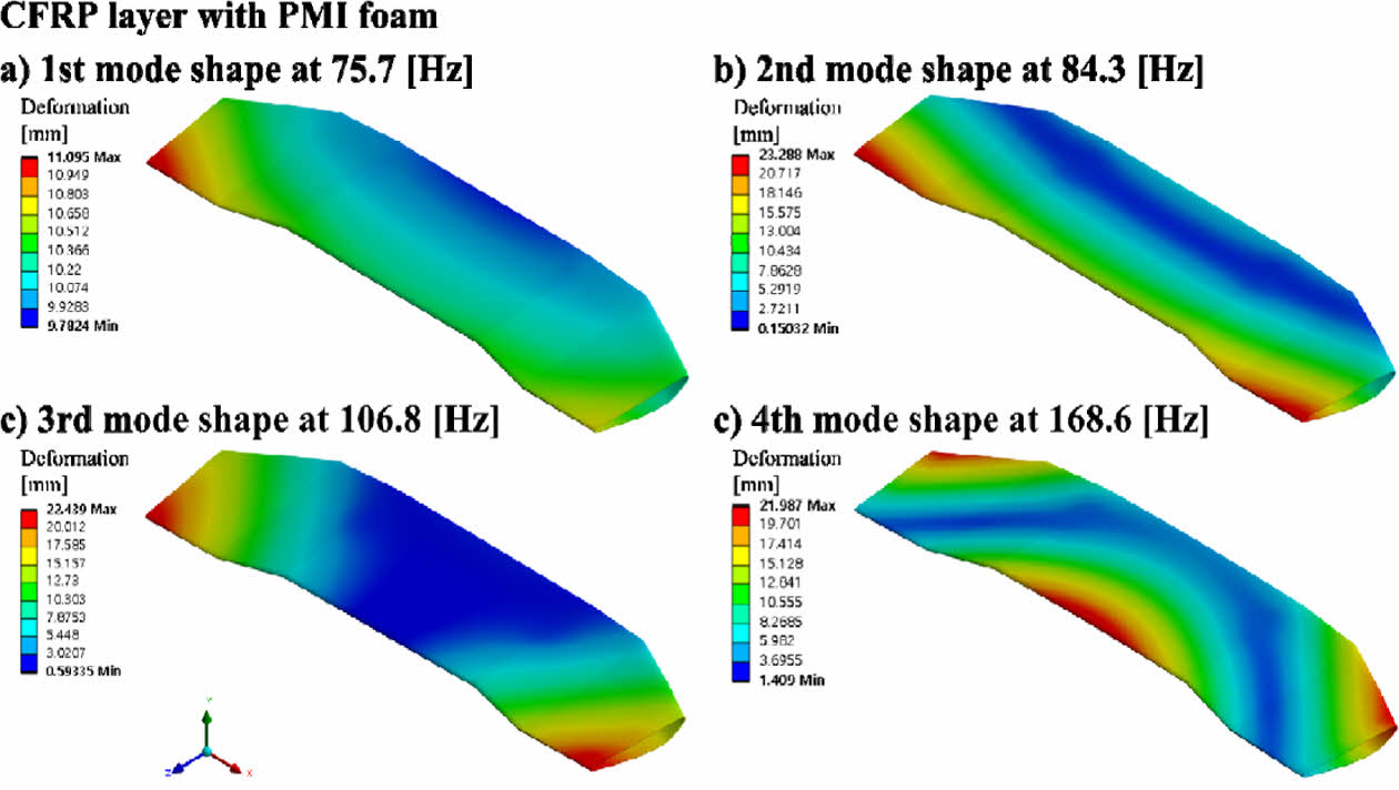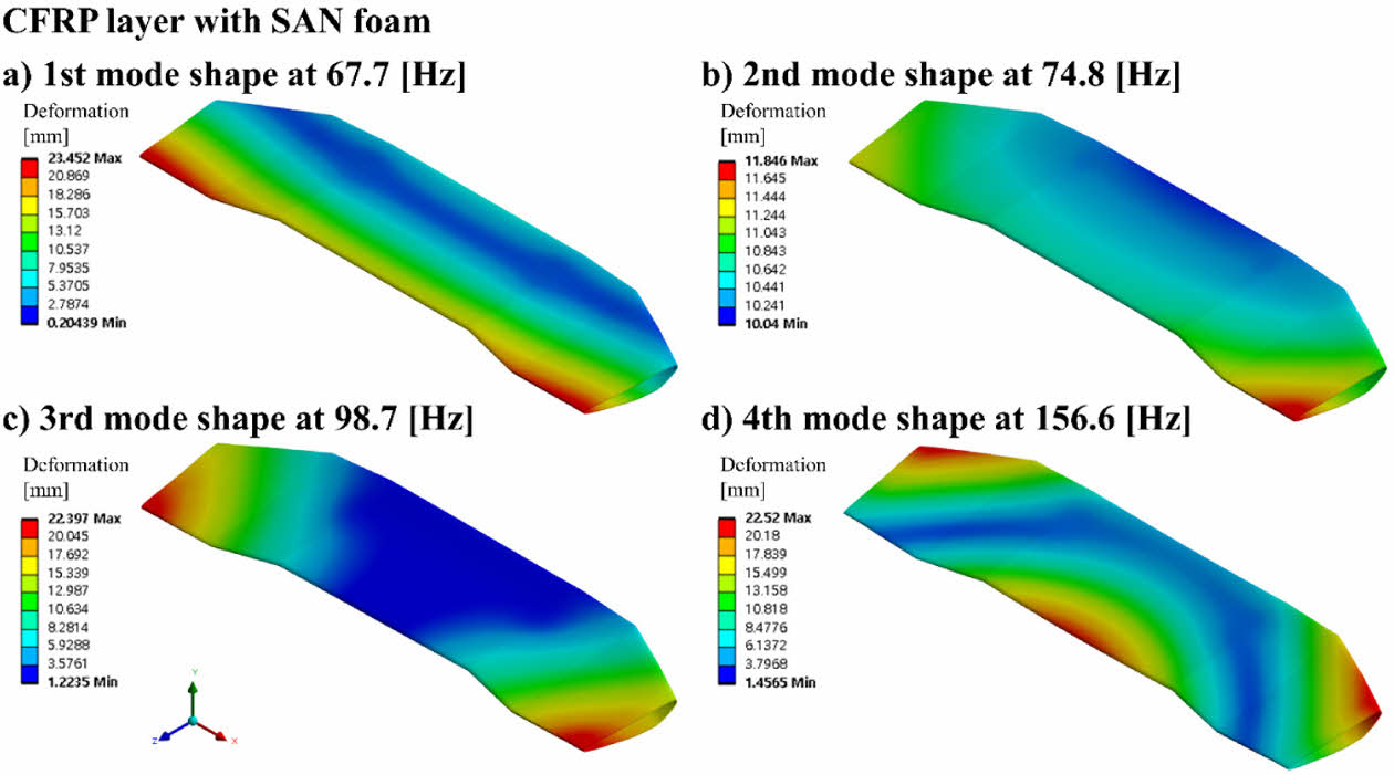 CFRP 리어 스포일러의 폼 코어의 종류에 따른 진동 특성 결과에서는 중공형의 CFRP 리어 스포일러가 비교군 중 모든 차수의 고유 진동수 값에서 가장 낮은 값을 나타냈다. 내부 폼 코어가 있는 CFRP 리어 스포일러의 진동 특성 결과는 1차 고유 진동수 기준 PVC, PMI, SAN 순서로 높은 고유진동수값을 나타냈다.