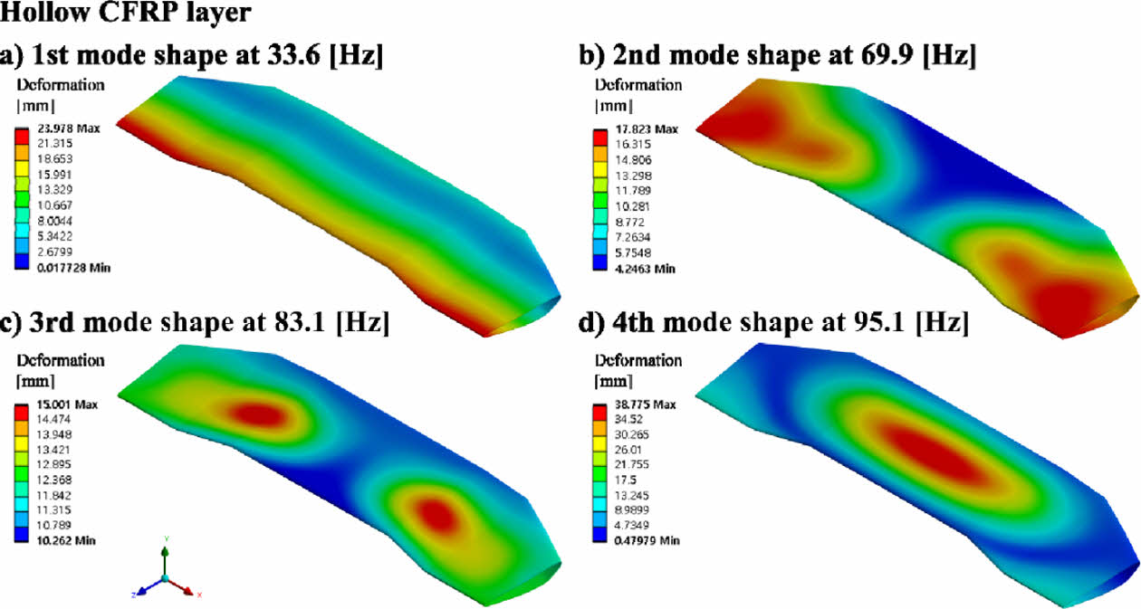 CFRP 리어 스포일러의 동적 특성을 알기 위해 고유 진동수 해석을 진행하고 중공형 CFRP 리어 스포일러를 기준으로 중공형 대비 내부 폼 코어가 있는 3종의 고유 진동수 값을 비교한다. Fig. 9