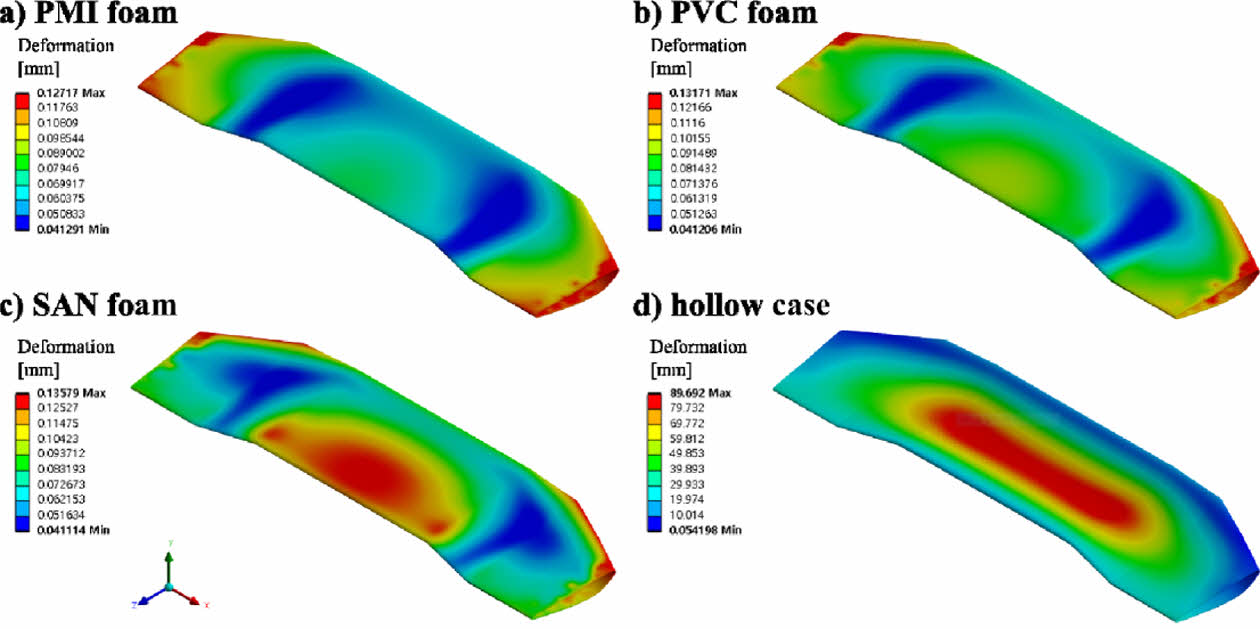 Fig. 13 Deformation results for the CFRP rear spoiler: a) PMI foam, b) PVC foam, c) SAN foam, d) hollow case |