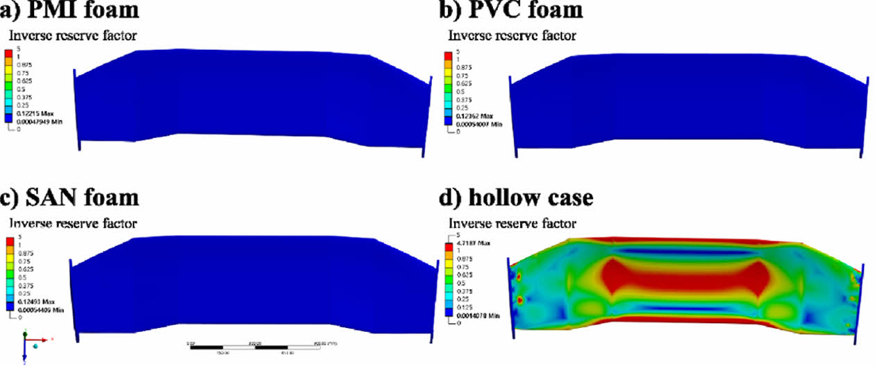Fig. 15 Inverse reserve factor results of hollow case CFRP rear spoiler: a) PMI foam, b) PVC foam, c) SAN foam, d) hollow case |