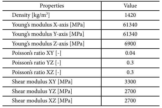 본 연구에서 CFRP 리어 스포일러에 사용할 CFRP는 230 GPa 급 탄소섬유를 Woven 형태로 직조한 epoxy carbon prepreg 를 선정하였다. 선정한 230 GPa 급 epoxy carbon prepreg는 중탄성급 프리프레그로서, 높은 경제성 및 제조성을 가지면서도 자동차 분야에서 요구하는 물성 요구치를 만족할 수 있기 때문에 자동차 부품 산업에서 활발히 사용되고 있다[15]. 본 연구에서 활용할 CFRP의 주요 물성은 Table 1에 표기하였다.