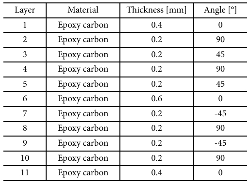일반적으로 CFRP는 이방성을 가지고, 적층 방향에 따라 그 물성이 달라지기 때문에 여러 방향을 사용하여 CFRP를 적층하여 제작하게 된다[16,17]. 본 연구에서는 다양한 방향을 가지는 11개의 CFRP 층을 사용하였으며, 이러한 11개 층의 총 합은 Section 2.1에서 소개한 CFRP 총 두께 3 [mm] 와 같다. 상세한 각 층의 두께 및 적층 각도는 Table 2에 표기하였다. 다음 섹션에서는 CFRP 리어 스포일러에 사용할 내부 폼 코어에 대하여 소개한다.
