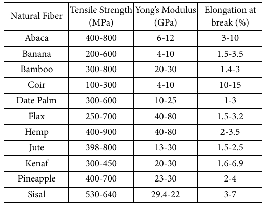각 식물기반 섬유의 기계적 특성은 고분자 조직과 세포벽의 분자 상호 작용에 결정적으로 의존한다. 가장 중요한 매개변수는 섬유의 밀도로 알려진 세포벽(Cell wall)과 내강(Lumen)의 비율과 세포벽 층의 셀룰로오스의 방향이다. 기계적 특성이 전체 섬유 단면과 관련될 때 밀도가 높은 섬유는 밀도가 낮은 섬유보다 더 단단하고 강하다[11]. 또한 제조 및 처리과정은 섬유의 내구성과 기계적 특성에 영향을 미칠 수 있다. Table 2는 다양한 천연섬유의 기계적 특성을 보여준다.