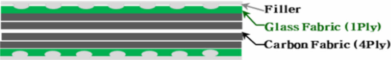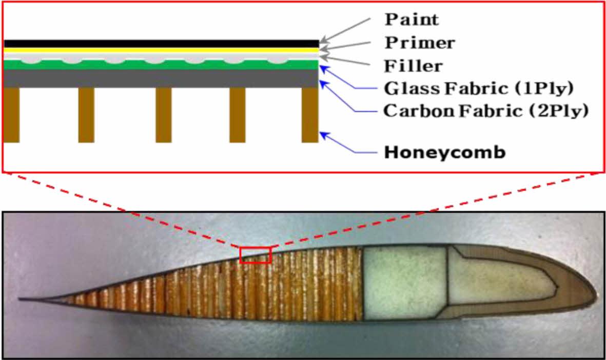 블레이드의 구조는 사용되는 재료 및 위치에 따라 다르지만 가장 일반적인 구조는 Fig. 1과 같이 복합재 외피와 노멕스 하니콤 코어(Nomex honeycomb core)로 이루어진 구조이다. 일반적으로 표면 품질을 향상시키기 위하여 도장 작업 전에 필러(filler)를 적용한다.