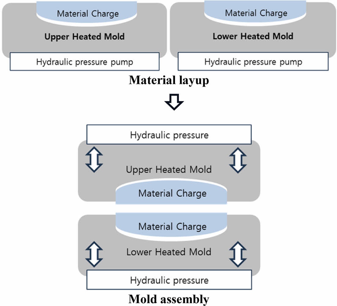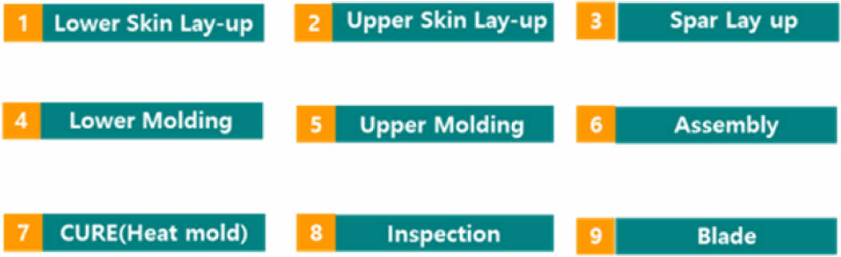 이동형 모빌리티 블레이드의 일반적인 제작 공정 순서는 Fig. 2와 같다. 블레이드 제작 공정 중 특이한 사항은 오토클레이브를 사용하지 않고 자체로 가열 기능이 있는 폐쇄형 가열 금형(close heat mold)을 사용하여 복합재를 경화하는 것이다. 폐쇄 금형은 상형과 하형으로 구성되어 있으며 복합재료 경화온도까지 가열할 수 있는 경화장치가 부착되어 있다. 일반적으로 복합재료 성형 공법에서 폐쇄 금형은 RTM(resin transfer molding) 공정[4]에 사용되는 치구이나 최근에는 프리프레그 성형에도 사용되고 있다. 프리프레그 및 각종 부품으로 조립된 성형 전 블레이드의 경우 진공필름(vacuum bag film)을 사용하지 않고 Fig. 3에서와 같이 폐쇄 금형의 상하부의 결합으로 블레이드 조립품에 기계적 압력과 열을 가하여 블레이드 구조물을 제작한다. 이후 각종 구조물이 조립되어 최종 도장 후 블레이드가 완성되어 이동형 모빌리티에 장착된다.