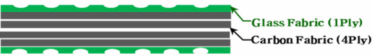 진공 오토클레이브 성형 제작 공법이 아닌 폐쇄 금형을 사용하여 프리프레그를 오븐에서 경화하였기 때문에 Fig. 12에서와 같이 시편의 표면이 매끄럽지 못하고 일부 부위가 수지로 채워지지 못한 상태가 발견되고 있다. 이는 진공백 성형 공정에 비해 경화 중 압력의 균일성이 떨어지고, 수지가 경화하면서 발생하는 휘발 성분의 자연 배출에 기인한 것으로 판단된다.