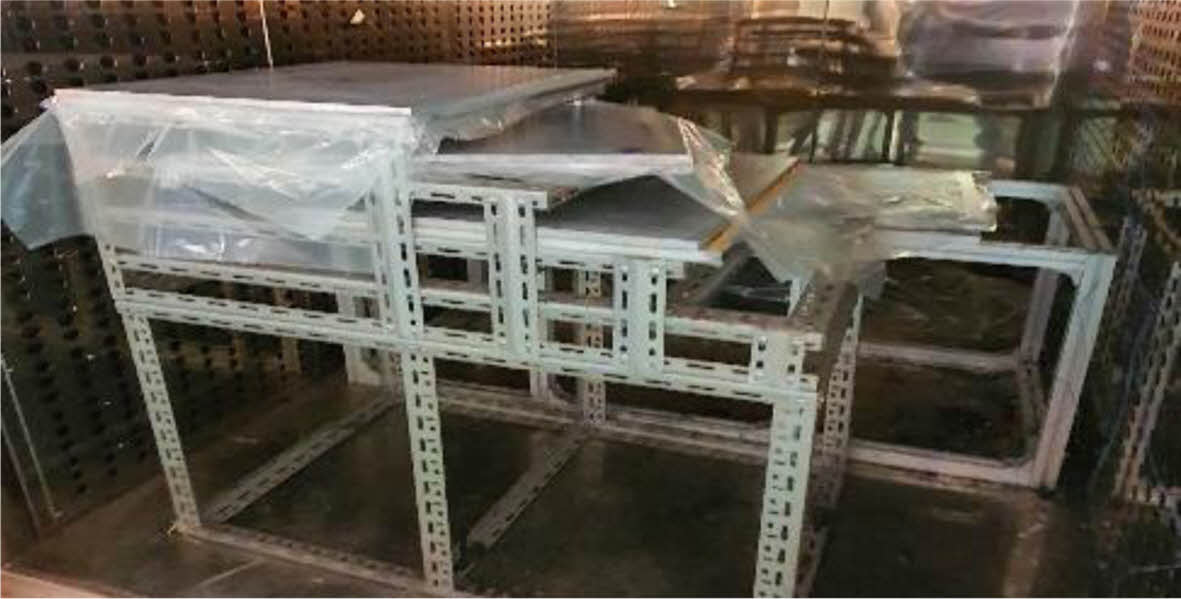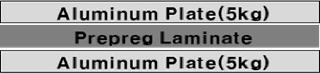 카본 평직 프리프레그(carbon fabric prepreg)는 무한컴포지트사의 WSN-3KY (plain weave), 유리섬유 평직 프리프레그(glass fabric prepreg)는 GEP 118(plain weave)을 사용하였다. 블레이드 폐쇄 금형과 유사한 형태로 하형 적층 후 Fig. 7과 같이 상형 플레이트를 적층판에 결합하여 Fig. 8과 같이 오븐에서 경화하였다.