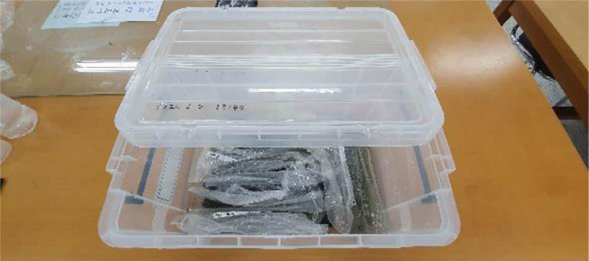 Table 1의 시편을 상온 증류수 수조(Fig. 11)에서 수분 노출 전부터 최대 33주(231일)까지 노출 기간 동안 초기 4주동안에는 매주, 이후는 측정 주기를 늘려가며 시편 표면의 수분을 제거한 후 정밀 전자 저울에서 시편의 무게를 측정하였다.