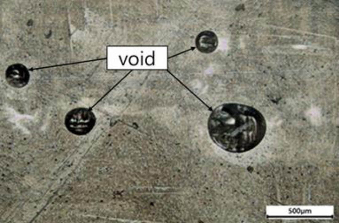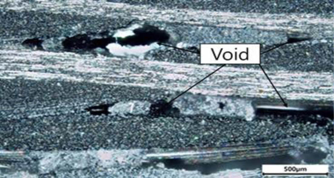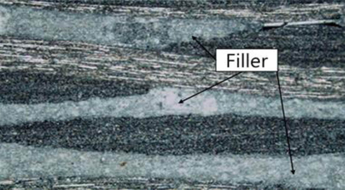 Fig. 14는 시편의 단면을 확대한 사진이다. 앞에서도 언급하였듯이 폐쇄 금형으로 경화된 특성으로 수지가 채워지지 않는 빈 공간을 볼 수 있다. 시편의 단면에 필러 적용을 하면 Fig. 15에서와 같이 빈 공간이 없이 모두 필러로 채워진 것을 알 수 있다.
