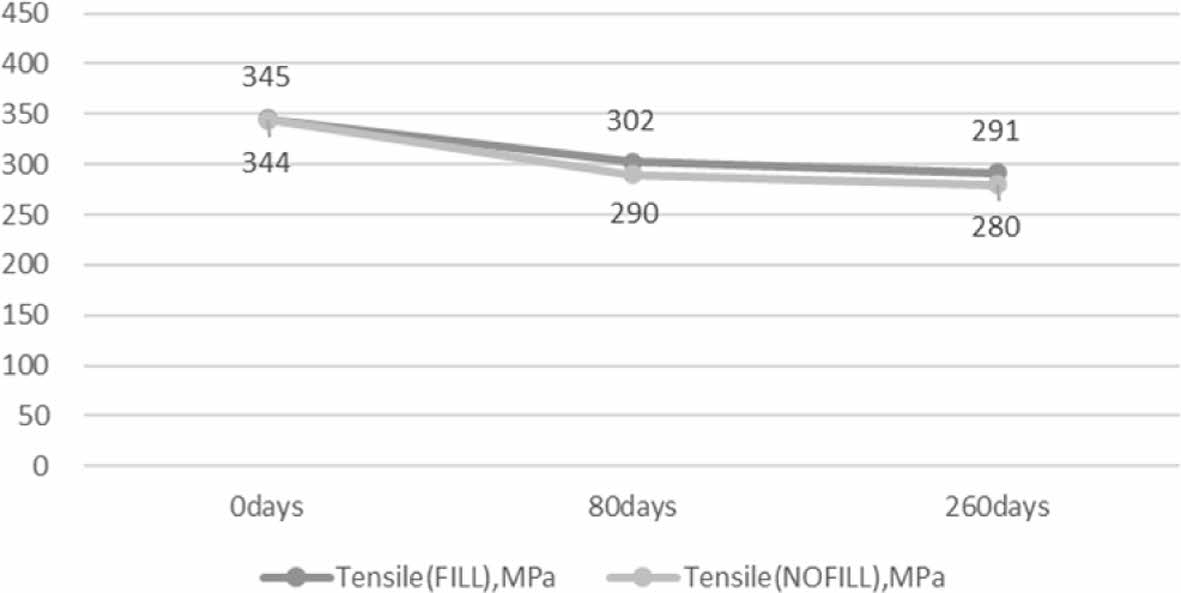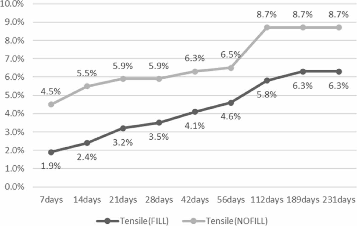 Fig. 18, 19에 보인 바와 같이 폐쇄형 금형에서 경화된 시편 또한 수분 침적 기간에 따른 시편 시험 결과는 이미 알려진 바와 같이 침적 기간이 증가할수록 인장 및 압축 강도값은 감소하는 것으로 확인되었으며 또한 Fig. 20에서 보듯이 필러 작업 수행 여부에 따라 강도값의 차이가 발생하는 것도 확인되었다. 수분 함침 전 및 후의 총 15개 평균 인장 강도에서는 필러 작업 시편이 약 5% 높으며 압축 강도에서는 약 22% 정도 높은 것으로 확인되었다. 이는 필러가 폐쇄형 금형에서 발생한 기공을 채어주므로 수분 함침전부터 강도값이 유사(인장강도)하거나 상대적으로 높게(압축강도) 나오며 이는 수분 노출후에도 동일하게 높게 나옴을 확인할 수 있으며 인장 강도의 경우는 수분 흡수율로 인하여 필러 작업을 수행한 시편의 강도가 수분 함침전보다 상대적으로 높았다