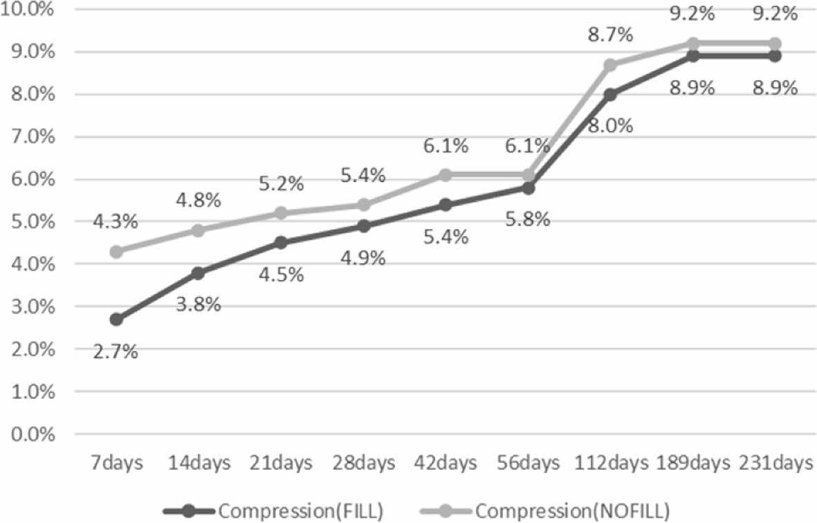 이전 연구 자료[2,13]에 따르면 오토클레이브 경화의 수분흡수율은 침적 기간에 따라 차이가 있지만 평균적으로 2% 내외로 나타난다. 하지만, 블레이드 제작 공정과 동일하게 제작된 시편의 231일 함침시 인장 시편 수분 흡수율(약 8.7%/필링미수행), 압축 시편 흡수율(약 9.2%/필링미수행)은 오토클레이브 경화 시편에 비해 상대적으로 높게 나타난다.