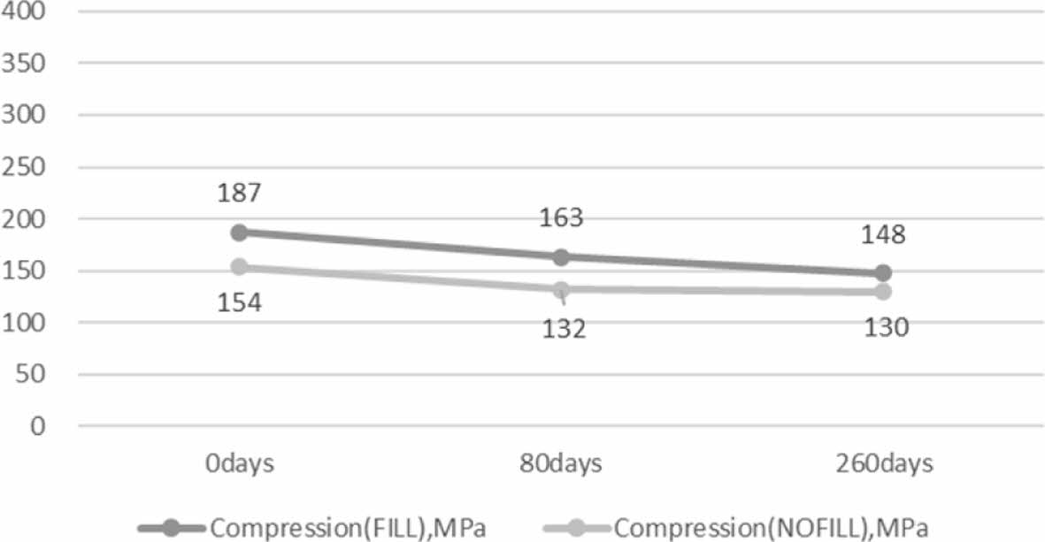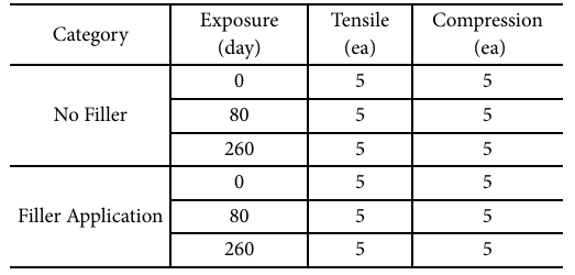 수분 함침 후 0일, 80일(1,920시간) 및 260일(6,240시간)이 경과한 시편을 강제 건조하지 않고 수분이 함침된 상태로 유지하면서 시험 전 시편 표면의 수분을 제거한 후 강도 시험을 수행하였다. 시험에 사용된 재료 시험기는 Instron 5582이고 상온 상태에서 압축 시험은 ASTM D6484[14] 인장시험은 ASTM D5766[15]에 따라 시험을 수행하였다.