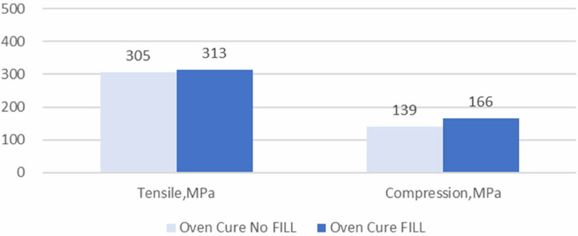 이는 시편 제작에서 폐쇄 금형 기반의 오븐 경화를 수행하기 때문에 기공성 기지 조직이 형성되고 기공성 기지 조직 내부로 수분 침투가 이루어지기 때문으로 볼 수 있다. 필러를 적용한 인장시편 및 압축시편의 수분 흡수율은 각각 6.3%와 8.9%로 표면 부근에 형성된 기공성 기지조직을 필러로 제거할 수 있어 필러를 적용하지 않은 시편에 비해 수분 흡수율이 상대적으로 낮은 것을 확인하였다. Fig. 16 Fig. 17