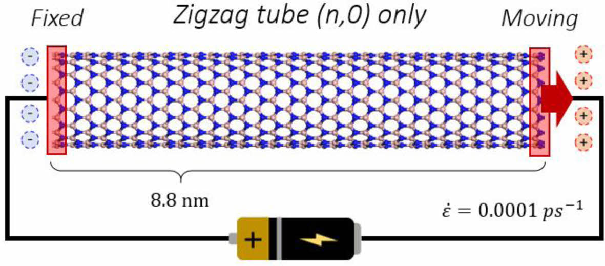 구조 평형화를 진행한 이후, BNNT에 1축인장을 부과하기 위해 Fig. 1과 같이 변위경계조건을 설정하여 정압전 전산모사를 진행하였다. 1축인장 전산모사는 0.0001/psec 의 진변형율 속도(true strain rate)로 진행하였으며, 진변형률이 2%에 이를때까지의 응력과 분극 값을 산출하여 BNNT의 영률과 압전상수를 계산하였다. 각각의 변형률 단계의 응력은 비리얼(virial)이론[19]을 바탕으로 도출하였으며, 분극은 전자-코어에 의한 분극 항을 제외하고 이온 분극 항만을 고려하여 다음과 같은 수식을 통해 계산하였다[12].