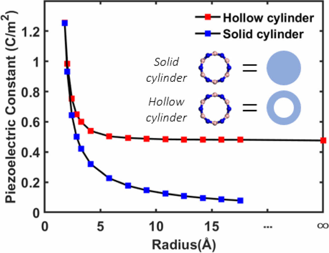 Fig. 3 Size dependency on piezoelectric constant of BNNT calculated through solid cylinder and hollow cylinder assumption |