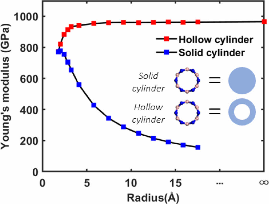 Fig. 4 Size dependency on Young’s modulus of BNNT calculated through solid cylinder and hollow cylinder assumption |