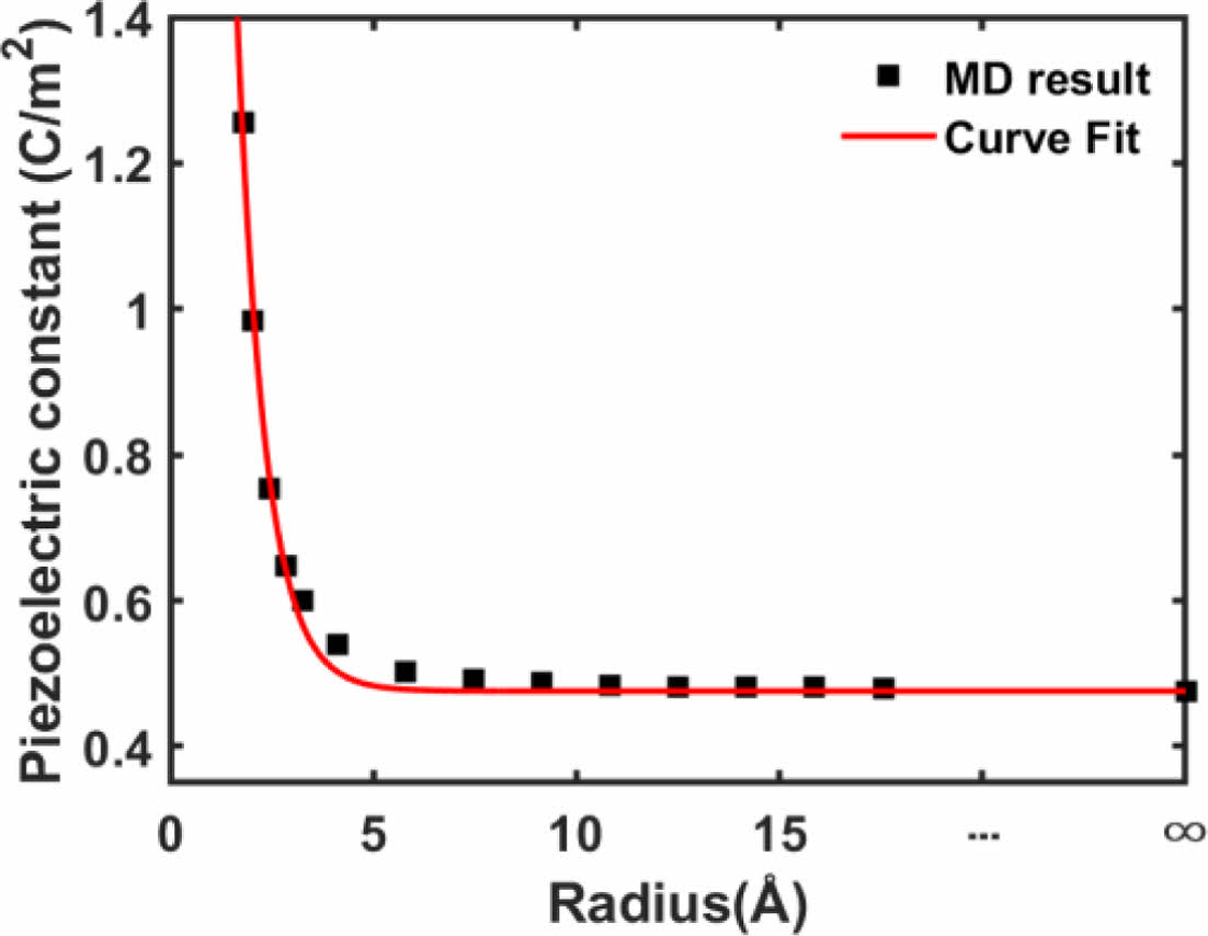 BNNT의 압전상수와 영률의 최소자승 근사 시 잔여값 R2는 0.9915, 0.9898로 계산되었으며, 나노튜브의 반경변화에 따른 압전탄성물성 변화를 근사한 결과는 Fig. 5와 6에 제시되어 있다. 식 (6)과 (7)에 제시된 근사모델은 BNNT의 크기변화에 따른 압전특성을 비교적 정확하게 반영하고 있다. 특히 BNNT의 반경이 가장 작은 (5,0) 튜브의 경우, BNNS에 비해 약 3배정도 높은 압전상수값을 보이고 있다. 또한 BNNS의 압전상수는 약 0.48C/m2 수준이며, 이 값은 기존의 제일원리계산 결과와 비교할 때 매우 유사한 수준이라 할 수 있다[17]. 따라서 Tersoff 포텐셜을 적용한 분자동역학 전산모사기법은 BNNT의 압전특성 예측에 있어 비교적 정확한 계산결과를 제공한다고 결론지을 수 있다. 특히 제일원리 계산은 온도변화에 따른 압전상수를 예측할 수 없으나, 앙상블 전산모사를 적용하는 분자동역학 전산모사는 이러한 온도효과를 반영할 수 있다는 점에 있어 BNNT를 에너지수확형 복합재로 적용하기 위한 나노복합재 설계에 있어 매우 유용한 가상실험 도구로 활용될 수 있다.