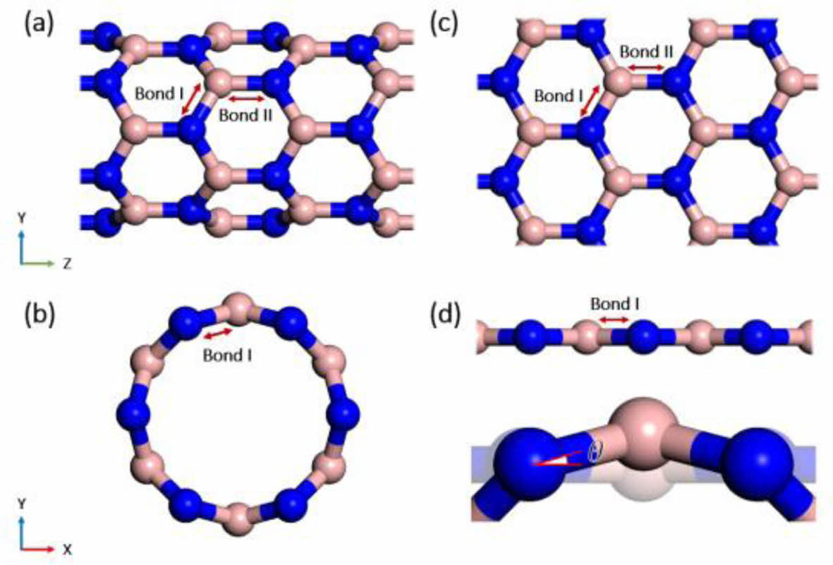 Fig. 7 Representative bond component of hexagonal Boron nitride structure (a) Transverse view, (b) Longitudinal view of BNNT (c) Top view of BNNS (d) Curvature structure of BNNT compared to BNNS |