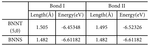 BNNT의 키랄성에 따른 구조-물성 상관관계를 분석하기 위해 Fig. 7과 같이 육방정계 질화붕소 구조를 유한한 곡률을 가지고 있는 BNNT (5,0)와 평면형을 유지하고 있는 BNNS에 대해 구조안정화를 진행한 이후 질소-붕소 간 결합상태를 상호비교하였다. 질화붕소의 육방정구조를 고려하여, Fig. 7(a)와 (c)에서 처럼 길이방향(Bond I)과 원환방향(Bond II)으로 배열된 2개의 질소-붕소 결합을 고려하였으며, 안정화된 구조에서의 결합길이와 결합에너지를 Table 2에 제시하였다. 그 결과 원환방향으로 배열된 Bond I의 경우 (5,0) BNNT 내에서의 결합길이가 BNNS에서의 경우보다 더 길며, 결합에너지의 크기는 더 작은 것으로 확인되었다. 이는 평면을 유지하는 시트구조에서 유한한 곡률을 가진 튜브형태로 변형되는 과정에서 Bond I의 결합강도가 약해짐을 의미한다. 또한 길이방향으로 배열된 Bond II의 결합길이 역시 Bond I에 비해서는 차이가 적지만 동일한 경향을 보이고 있으며, 이로 부터 BNNT의 반경이 감소(곡률이 증가)함에 따라 길이방향 영률이 영향을 받게됨을 알 수 있다.