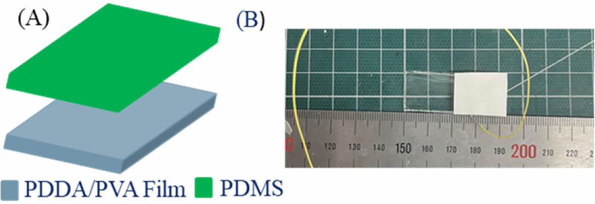Fig. 1 Design layout of TENG mechanism (A) and PVA-PDDA free-standing film (B) |