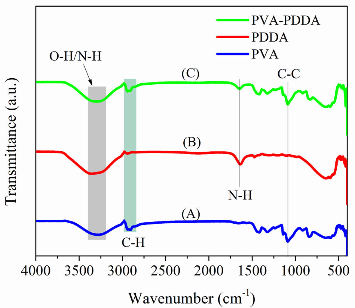As illustrated in Fig. 2, FT-IR analysis provides valuable insight into the structural composition of the film. In the spectrum of neat PVA, the characteristic peaks at 3438 and 2930 cm-1 correspond to N-H/OH and C-H stretching, respectively. Additionally, the peaks at 1640 and 1091 cm-1 are assigned to C-C and C-O bending, respectively, confirming the presence of PVA (Fig. 2A) [7]. The FT-IR spectrum of PDDA exhibits peaks at 3355 (N-H and OH), 2930, and 1468 cm-1 (C-H stretching), confirming its distinct chemical fingerprint (Fig. 2B) [8]. Upon blending PVA and PDDA (PVA-PDDA), all characteristic peaks of the individual constituents are retained, indicating the successful incorporation of both polymers into the composite material (Fig. 2C). This FT-IR analysis highlights the compatibility and stability of the blended components in the composite films. This information is critical to understanding the molecular interactions within the composite and lays the foundation for further exploration of the material's properties and functionality.