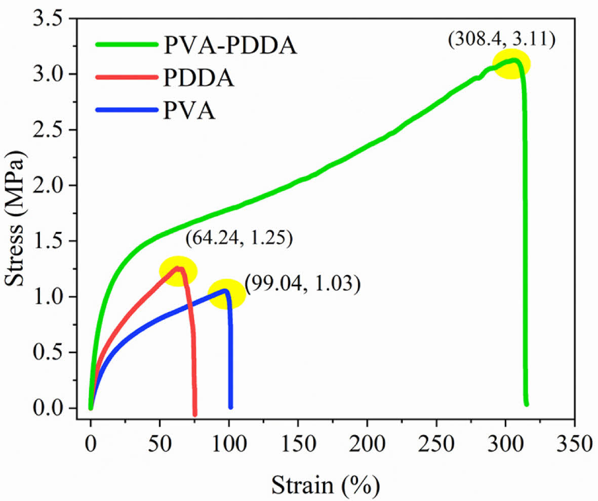 Fig. 3 Stress-strain curves of PVA, PDDA, and PVA-PDDA films |