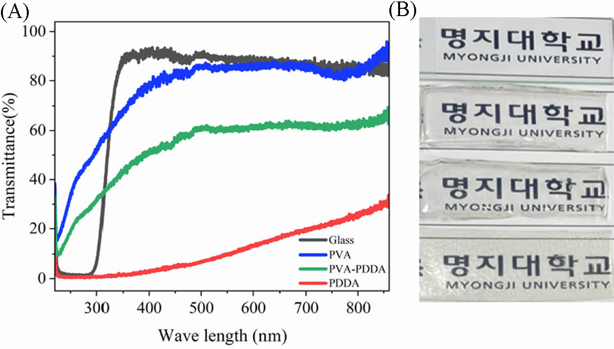 The transparency of the polymer films was evaluated through transmittance measurements using UV-Vis spectroscopy, as shown in Fig. 4A. The PVA-PDDA free-standing film exhibits a transmittance of 60% across visible wavelengths from 400 to 800 nm, demonstrating improved transparency over the individual components. Specifically, the PVA free-standing polymer shows a transmittance of 85%, while the PDDA exhibits only 20%, emphasizing the considerable improvement achieved through polymer blending [11]. This suggests that incorporating PDDA into the blend significantly enhances the overall transparency of the polymer film, which could be beneficial for applications requiring optical clarity and light transmission. Additionally, to directly compare the transparency of each free-standing film, it was visually depicted through photographic images with glass slides (Fig. 4B).