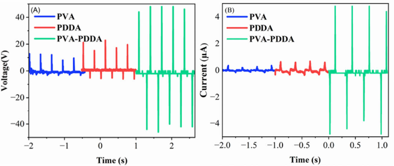 In addition to characterizing the mechanical properties and transparency of the PVA-PDDA composite films, the study also takes a closer look at the electrical performance of the films using TENG technology. By analyzing the voltage and current outputs of the TENG system, the study aims to evaluate the effectiveness of polymer blends in enhancing energy harvesting compared to individual PVA or PDDA polymers.