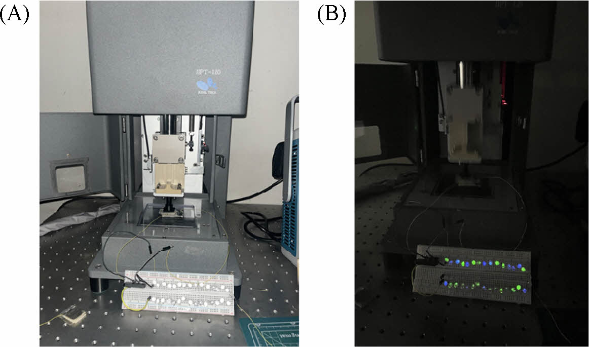 Fig. 6 Pushing tester (A) and illuminated LED light (B) for vertical contact-separation mode experimentation |