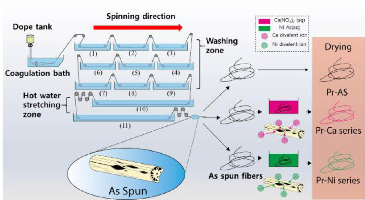 흑연화 촉진제 처리: 흑연화 촉진제를 담지하기 위해 열수연신 공정 이후, 팽창되어 있는 섬유 상태에서 흑연화 촉진제 용액에 30분간 침지 후 오븐에서 80oC로 하루동안 건조 후 소성 공정을 실시하였다(Fig. 1). 3종 PAN 섬유(방사 후 섬유(Pr-AS), Ca(NO3)2 용액 침지 섬유(Pr-Ca), Ni(OCOCH3)2 용액 침지 섬유(Pr-Ni)가 제조되었으며, 흑연화 촉진제 용액의 비율은 Table 1에 나타냈다.