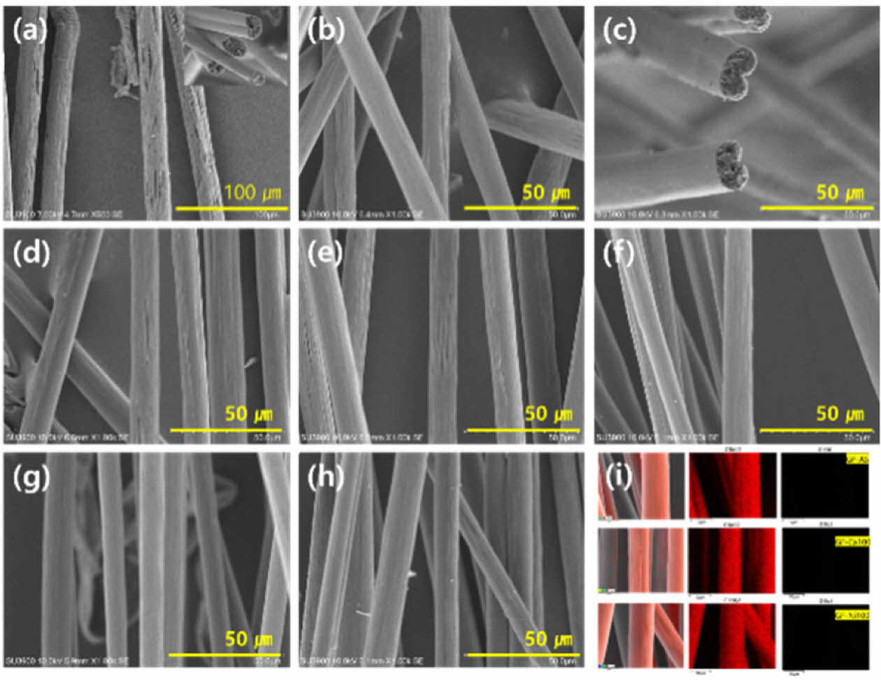 흑연화공정 후 섬유의 직경은 13.1 μm에서 8.8 μm로 약 32.8% 감소하였으며 표면의 주름 및 기공이 확연히 감소한 것을 확인할 수 있었다(Fig. 2(f)~(h)). 이러한 사실은 탄화 공정 후의 섬유 직경의 감소와 유사한 경향을 보였다. 흑연화 후 섬유 표면에 잔류하는 흑연화 촉진제를 확인하기 위해 EDS로부터 Ca과 Ni 원소를 측정하였다(Fig. 6). Ca의 경우 1,500oC 열처리 시 분해되어 0.3%로 측정되었다(Fig. 3(a)). 이는 Ca(NO3)2의 분해거동으로 이해할 수 있으며, Zhao의 보고에 따르면 550-600oC 불활성 분위기 하에서 열처리 시 Ca(NO3)2는 CaO의 형태로 산화되는 현상을 보고하였으며[21], Lee의 보고에 따르면 1,400oC 부근에서 탄소섬유 표면에서 CaO가 대부분 분해되지만, 1,600oC 이상의 열처리에서도 일부 잔량이 검출됨을 보고하였다[12]. 한편, 2,400oC 열처리 시 Ca 원소는 가스화되어 표면에서 사라진 것을 확인 할 수 있었다(Fig. 6(a)). Ni의 경우 1,500oC 열처리 시 분해되어 0.07%로 측정되었다(Fig. 3(b)). De Jesus의 보고에 따르면 Ni(OCOCH3)2는 활성 및 불활성 분위기에서 350oC로 열처리하였을 때 NiO 혹은 Ni 금속으로 형성되는 현상을 보고하였으며, 600oC 이상 열처리 시 NiO가 Ni 금속으로 환원되는 현상을 보고하였다[22]. 이후, 2,400oC 열처리 시 Ni 금속이 완전히 분해되지 않고 약 0.02% 일부 잔류하는 것이 확인되었다(Fig. 6(b)).