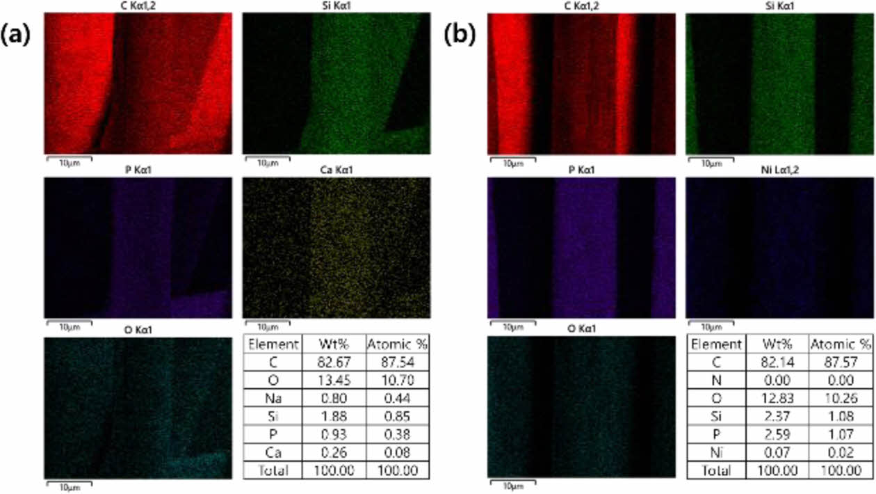 Fig. 6 EDS mapping of (a) Ca-treated graphitized carbon fibers (GF-Ca100) and (b) Ni-treated graphitized carbon fibers (GF-Ni100) |