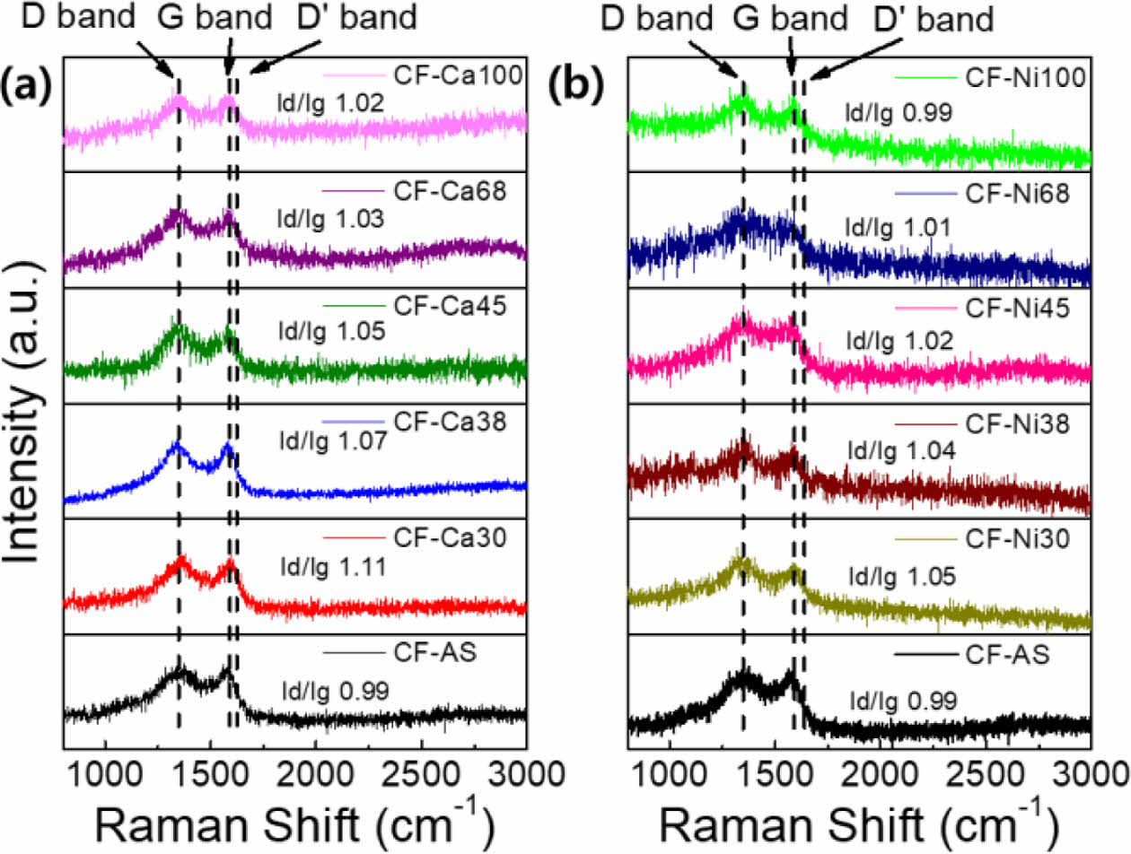 Fig. 4 Raman spectra of (a) CF-As and CF-Ca series (CF-Ca30, CF-Ca38, CF-Ca45, CF-Ca68 and CF-Ca100) and (b) CF-As and CF-Ni series (CF-Ni30, CF-Ni38, CF-Ni45, CF-Ni68 and CF-Ni100) |
