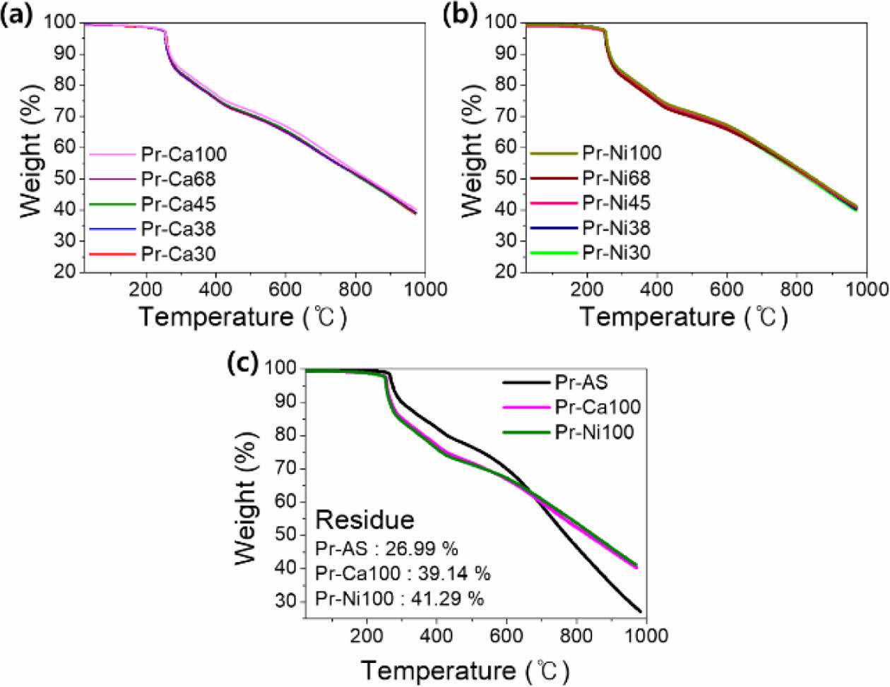 Fig. 5 TGA curves of (a) Pr-Ca series (Pr-Ca30, Pr-Ca38, Pr-Ca45, Pr-Ca68 and Pr-Ca100) and (b) Pr-Ni series (Pr-Ni30, PrNi38, Pr-Ni45, Pr-Ni68 and Pr-Ni100) and (c) comparison of Pr-As, Pr-Ca100 and Pr-Ni100 |
