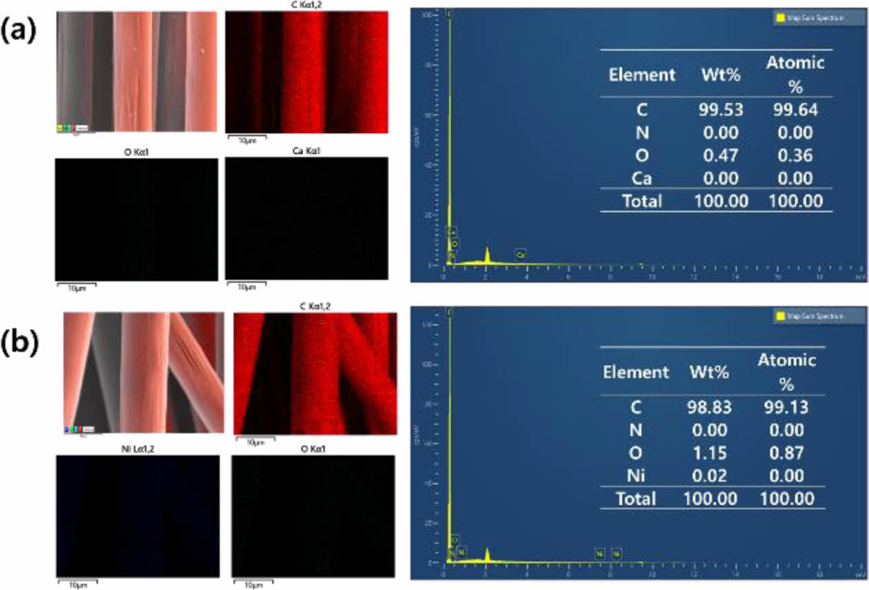 Fig. 3 EDS mapping of (a) Ca-treated carbon fibers (CF-Ca100) and (b) Ni-treated carbon fibers (CF-Ni100) |